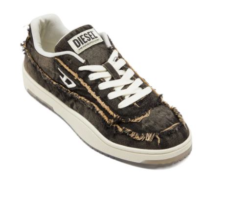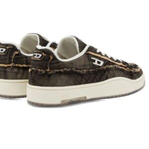 Men’s low-top sneakers. Classic silhouette with a creative touch of Diesel style. Made from treated denim with frayed details and an embroidered D logo on the side. The transparent part of the sole looks stylish and modern. Lace-up closure. Rubber sole with a grippy surface.