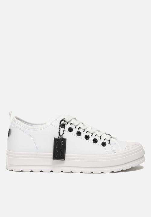 Step up your sneaker game with the Surge Perreno Lo Sneaker. Designed with vegan leather fabric for durability and style, these kicks feature a cushioned rubber outsole for maximum comfort. The sleek design is highlighted by gloss metal studds and speed racers , nylon binding, and a distinctive black rubber badge, making them a perfect addition to your urban wardrobe.