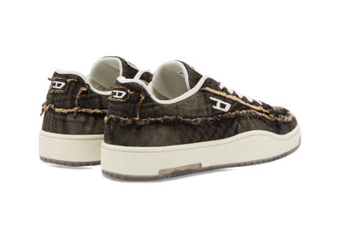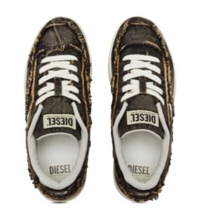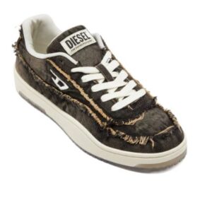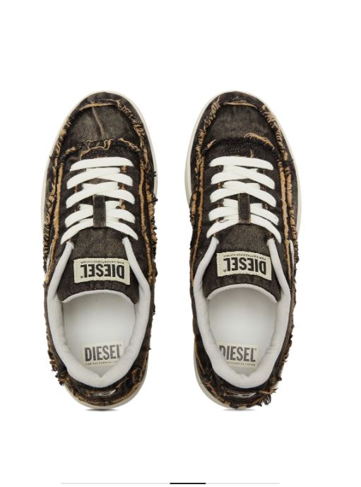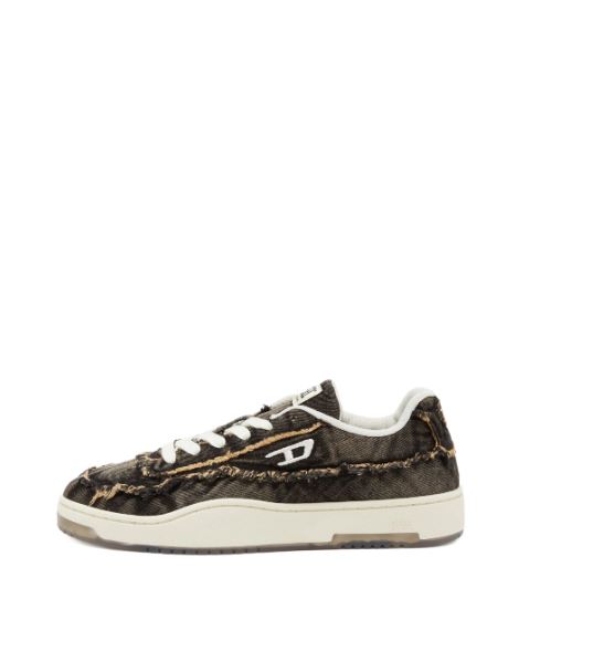 Men’s low-top sneakers. Classic silhouette with a creative touch of Diesel style. Made from treated denim with frayed details and an embroidered D logo on the side. The transparent part of the sole looks stylish and modern. Lace-up closure. Rubber sole with a grippy surface.