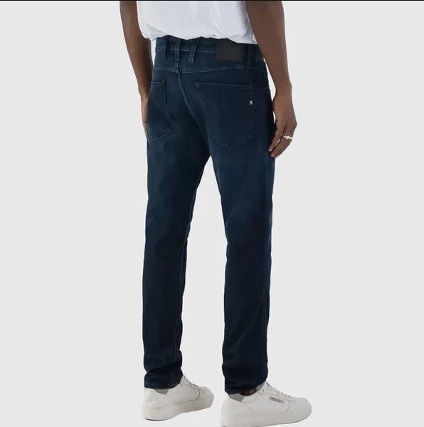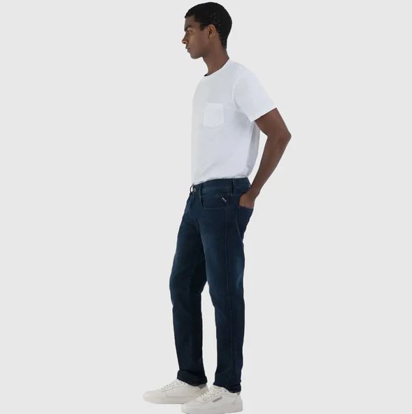 Slim fit jeans with a regular waist and a soft leg that tapers towards the bottom for a comfortable fit. The five-pocket garment ismade of a power stretch Indigo Denim with a dark enzymatic wash and manual whiskering and sanding that create contrasts in the parts most subject to wear. The iconic gull wing stitching characterizes the fifth pocket and the back pockets, one of which bears the Rembroidery, while on one of the front pockets there is a small personalized insert. The jeans have a button and zip closure